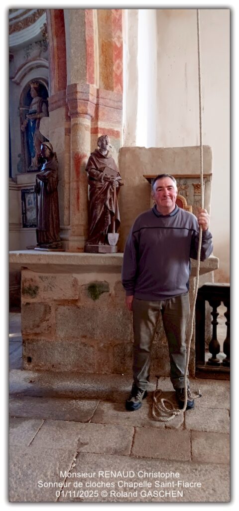Très belle découverte ce matin. J’ai eu la chance de croiser le chemin du sonneur de cloches de la Chapelle Saint-Fiacre. Après plusieurs mois de silence, j’ai entendu le son de cette superbe cloche datant de 1754. Un très grand Merci à Monsieur RENAUD Christophe pour le partage et à Monsieur ALLAIN Philippe pour l’accueil. .